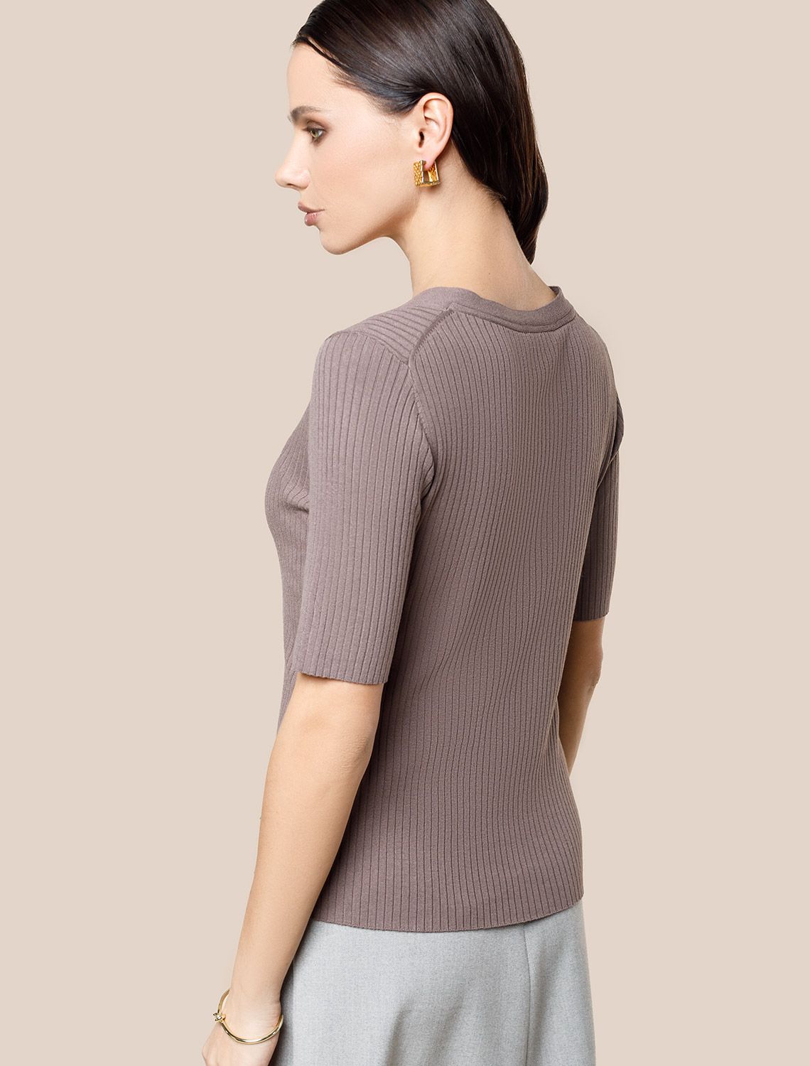 Джемпер тонкой вязки из вискозы с нейлоном. Для производства изделия использована пряжа сердечникового прядения — когда нейлоновая нить (основа) обвивается вискозой. Вискоза обеспечивает приятную тактильность и гигроскопичность, а нейлон предотвращает растяжение и повышает устойчивость к пилингуемости. Модель с V- вырезом прилегающего силуэта дополнена золотистыми пуговицами. Изделие дополнено фирменным металлическим логотипом бренда.