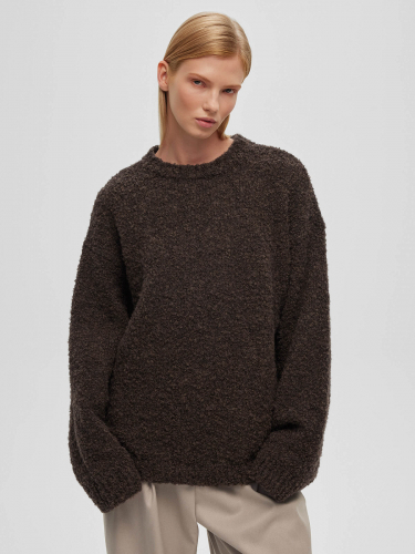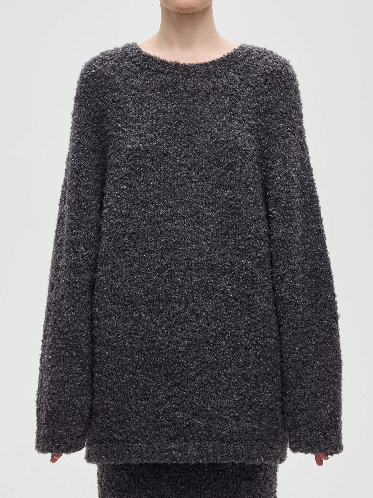 Джемпер удлиненный с круглым вырезом горловины и рукавом реглан. Изготовлен из фактурной смесовой пряжи с альпакой и шерстью в составе с эффектом букле.