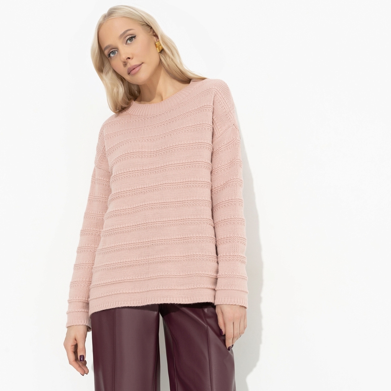 Возьмите курс на нежность. С любовью сделайте завтрак, аккуратно намазав булочки джемом, ласково разбудите семью и с улыбкой помогите всем собраться. Завершающий штрих – джемпер в цвете сливочно-малинового десерта. Джемпер свободного кроя. Линия плеча спущена. Изделие удлинено. Текстурная вязка.
