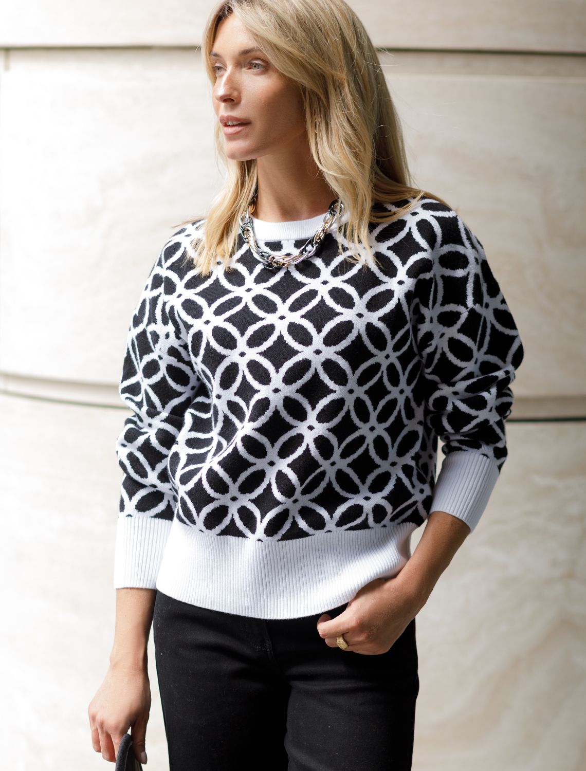 Джемпер жаккардовой вязки выполнен из мягкой пряжи на основе вискозы с добавлением кашемира. Очень приятная на ощупь пряжа дарит абсолютный комфорт, сохраняя оптимальную температуру не перегревая. Совет стилиста: модель с круглым вырезом и спущенной линией плеч гармонично дополнит повседневные образы с джинсами или брюками, при этом будет также выигрышно сочетаться с юбкой в заправку.