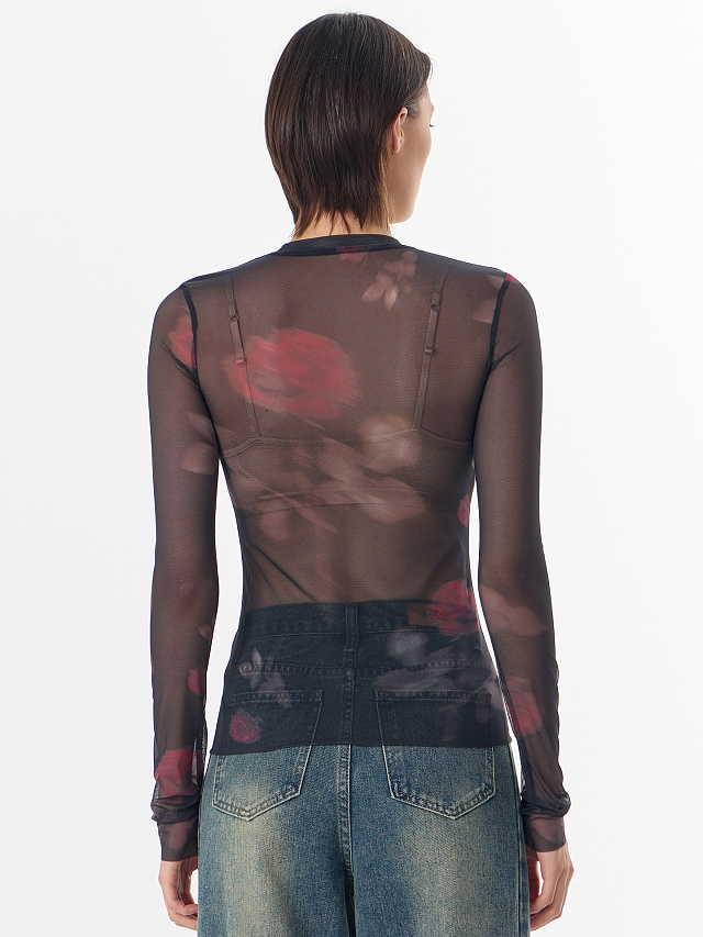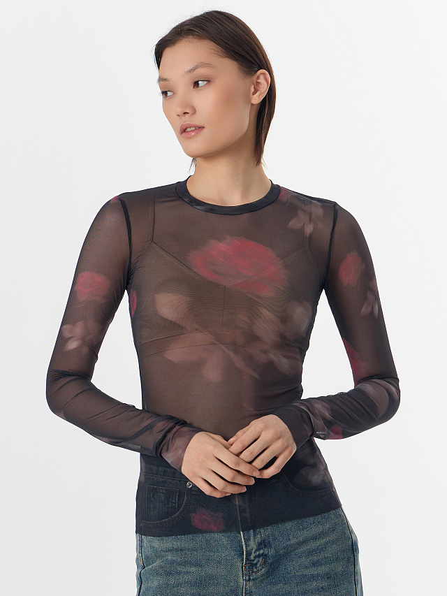 Нежные розы, проступающие сквозь сетчатую ткань, придают образу романтичное настроение. Этот джемпер станет идеальным спутником для вечерних мероприятий — он беспроигрышно смотрится в паре с кожаными брюками, юбками или джинсами с завышенной талией.