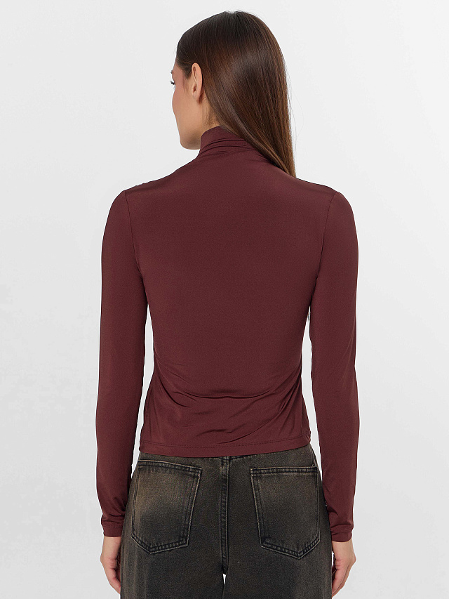 Перед и спинка изделия выполнены как одно целое, что создает гладкую поверхность без лишних швов. Изюминкой модели является изящная драпировка-сборка, заложенная сбоку спереди и в области плеча. Этот элемент добавляет женственности, создавая мягкие живые складки. Высокий воротник-стойка нежно обрамляет горло, придавая образу строгость и законченность.