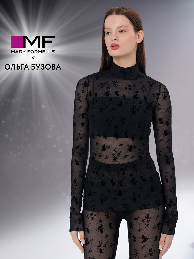 Черный джемпер из лимитированной коллекции Mark Formelle x Ольга Бузова с цветочным принтом создает стильный и актуальный образ. Прилегающий силуэт из трикотажа с фактурой сетки мягко подчеркивает линии фигуры, создавая эффектную и женственную посадку.