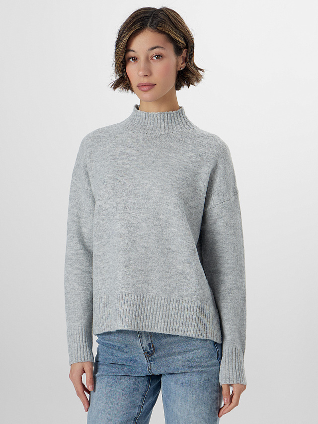 Женский джемпер для межсезонья с прямым силуэтом и уютным воротником-стойкой. Модель из мягкого трикотажа с добавлением шерсти обеспечивает комфорт в прохладные дни. Длинные рукава и лаконичный дизайн делают его подходящим для разных ситуаций, а классический покрой подчеркивает элегантность образа.