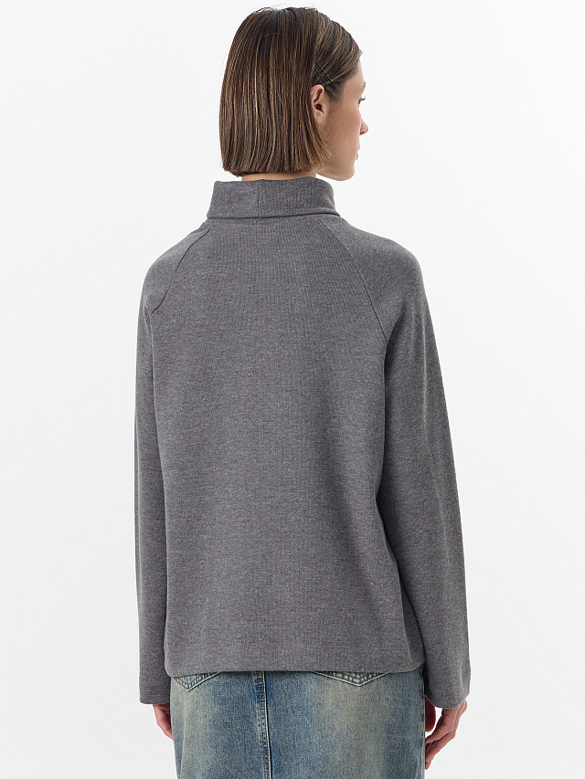 Воротник-стойка — деталь, которая делает этот джемпер по-настоящему универсальным. Он мягко облегает шею, обеспечивая дополнительное тепло и создавая лаконичный завершенный силуэт. Такой воротник не требует дополнительных аксессуаров — он сам по себе является выразительным элементом, который добавляет образу структурности и элегантности.