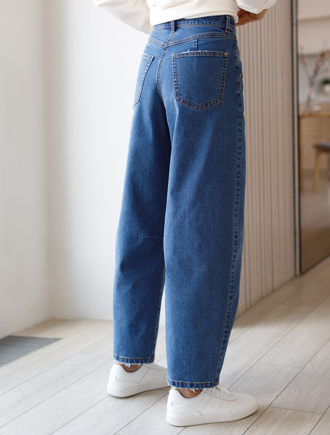 Широкие джинсы сочетаются с узкими ботильонами для трендового создания контраста объемов, а так же с обувью на плоском ходу. Эластичные свойства ткани обеспечивают удобные посадку и свободу движений — стрейч-материал делает повседневные джинсы особенно практичными для ежедневного гардероба. Прекрасно подойдет тем, кто ценит комфортные вещи без ущерба стилю. Эти багги легко комбинируются с укороченным верхом, облегающими водолазками или свободными рубашками в заправку, добавляя современный акцент любому комплекту.