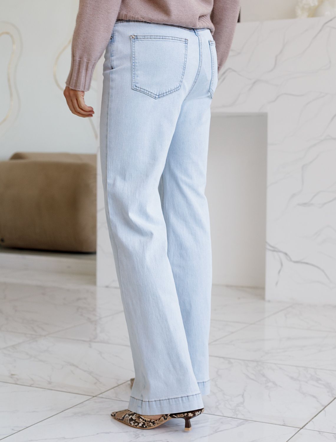 Джинсы-клеш в голубом оттенке выполнены из эластичного денима. Модель с декоративной стиркой и контрастной бежевой строчкой. Высокая посадка акцентирует талию и вытягивает силуэт. Изделие дополнено брендированным патчем. Подходит для любого типа фигуры.
