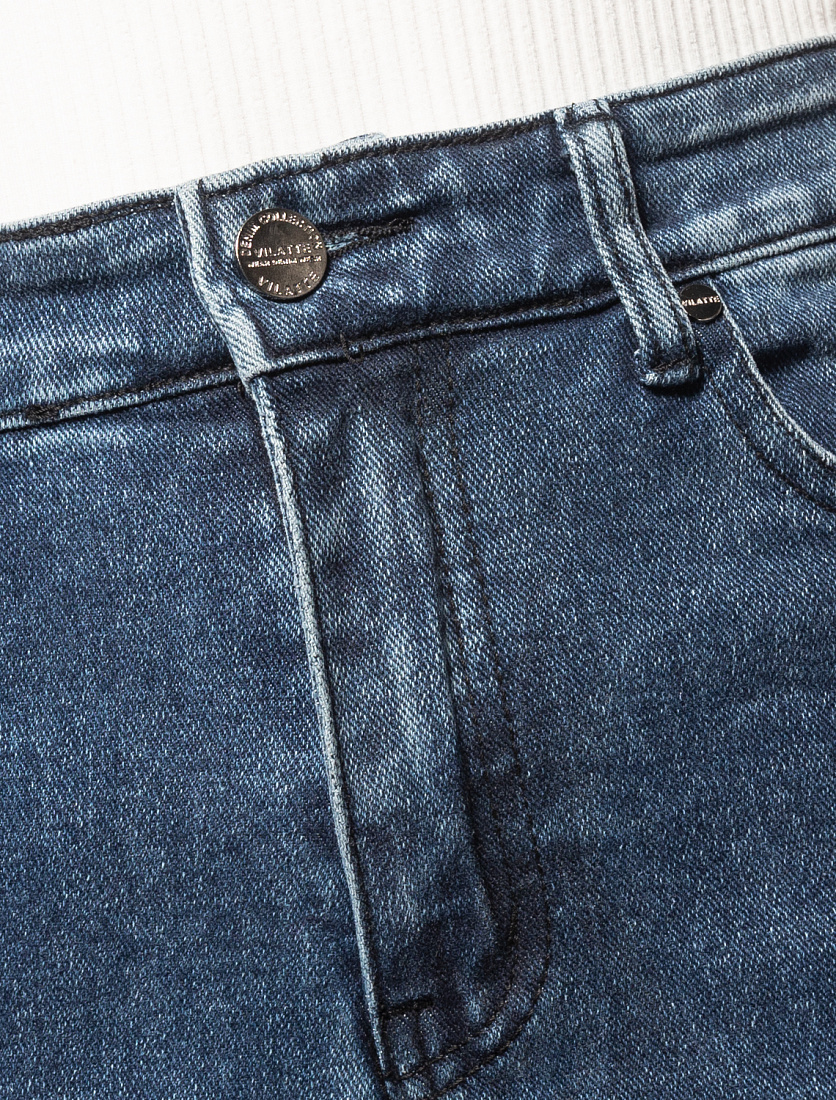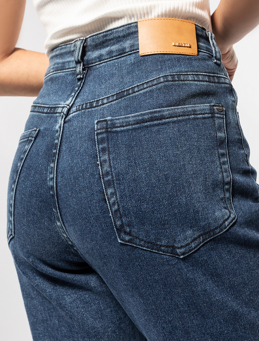 Джинсы mom-fit с высокой посадкой выполнены в темно-синем оттенке со стиркой. Эластичный деним способствует меньшей сминаемости. Плотно прилегают к телу и хорошо держат форму. Модель mom-fit максимально востребована по всему миру, потому что она подходит абсолютно любому типу фигуры. Изделие украшено фирменной высококачественной фурнитурой VILATTE.