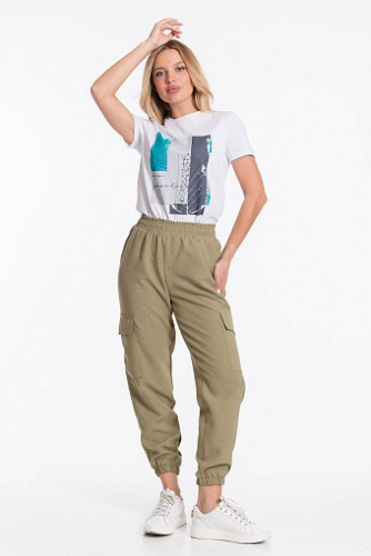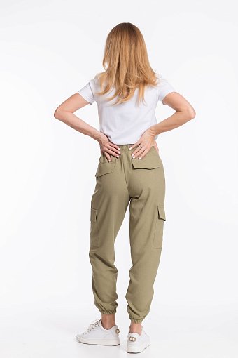 Пояс и низ брюк выполнены на резинке, что обеспечивает комфортную посадку и свободу движений. Боковые и накладные карманы с клапанами добавляют функциональность. Декоративные клапаны на задних карманах придают модели оригинальность.