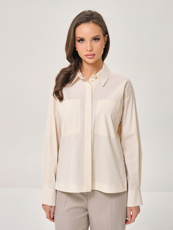 Модель прямого силуэта, со спущенным плечом и фигурной линией низа. Спереди потайная застёжка на петли и пуговицы и накладные карманы. Спинка с кокеткой, рельефами и горизонтальным подрезом. Под кокеткой складка. Воротник сорочечный. По низу рукава защипы, планка и манжета, которые застёгиваются на пуговицы. В боковых швах разрезы. Блузка декорирована отделочными строчками.