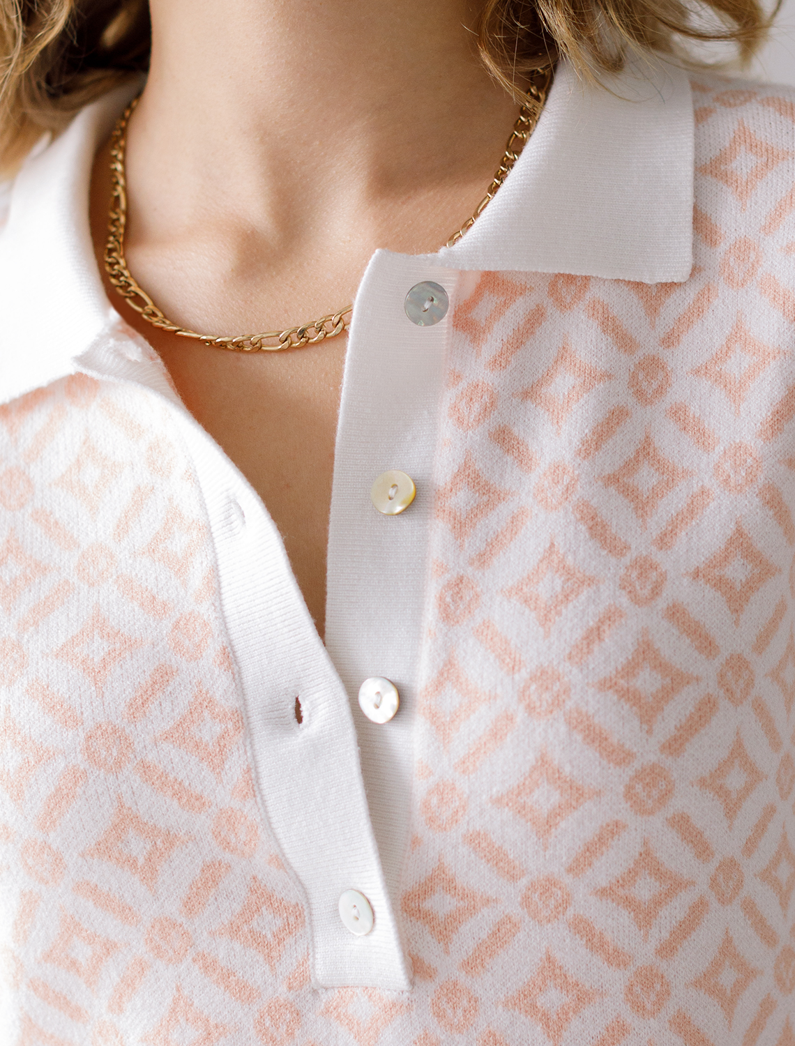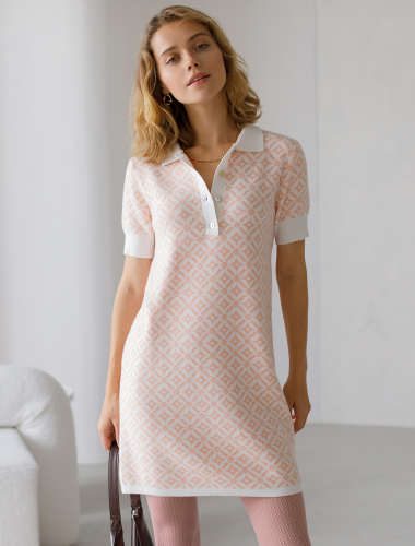 Платье длины мини с воротником поло выполнено из мягкого трикотажа на основе шелковистой эластичной вискозы. Жаккардовое переплетение образует геометрический узор. Застежка на перламутровые пуговицы подчеркивает гладкость пряжи. Контрастный воротник и манжеты делают узор еще более выразительным. Можно сочетать с жакетом D31.388 из жаккардовой коллекции.
