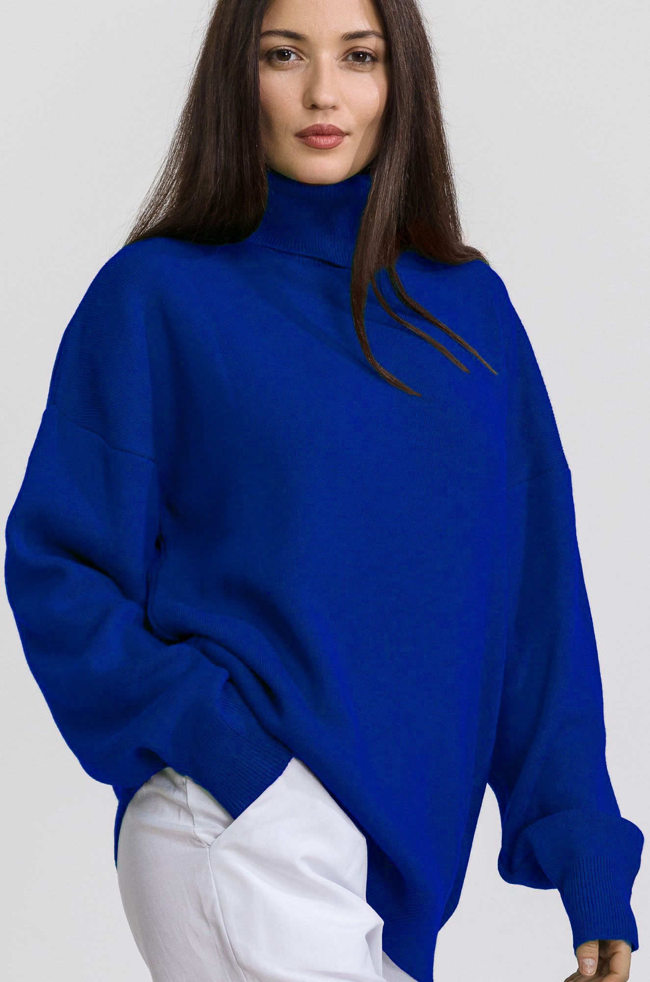*замеры выборочные, могут незначительно отличаться. длиненный синий свитер выполнен из вязаного трикотажа с добавлением натуральной шерсти и хлопка, что позволяет ему быть очень уютным, мягким и приятным к телу. Женский джемпер с высоким воротом позволит сохранить тепло морозной зимой.