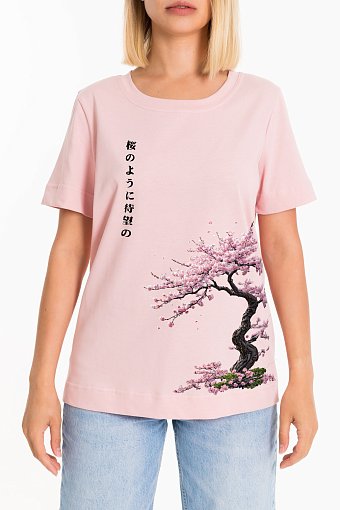Женская футболка с принтом изготовлена из хлопкового полотна, что обеспечивает комфорт и хорошую воздухопроницаемость. Футболка имеет короткий рукав и круглый вырез горловины, что придает ей классический стильный вид. Такая модель футболки отлично сочетается с джинсами, брюками или юбкой. Изготовленная из натуральной ткани, футболка обеспечит комфорт в течение всего дня.