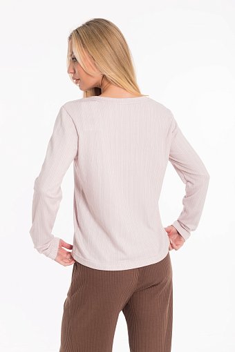 Женский лонгслив из кулирки фламли в вертикальную полоску. Модель свободного силуэта с втачным рукавом и круглой горловиной, оформленной планкой. Универсальный вариант для комфортных повседневных образов.