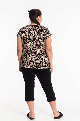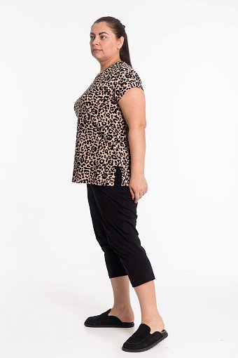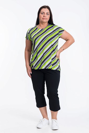 Женский костюм из кулирки — отличный выбор для повседневной носки. Футболка с ярким полосатым узором, спущенными рукавами и круглым вырезом украшена разрезами по бокам, что обеспечивает свободу движений. Однотонные капри гармонично дополняют образ. Этот яркий, современный дизайн одежды привлекает внимание своей смелой цветовой гаммой и геометрическим узором. Сочетание лаймового зеленого с черным, серым и белым создает энергичный и стильный образ. Изготовленный из натуральной ткани, костюм обеспечит комфорт в течение всего дня.