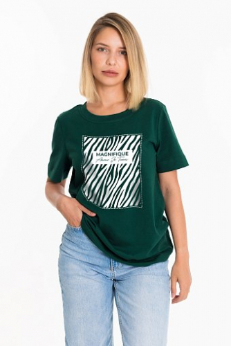 Женская футболка выполнена из поливискона. С коротким рукавом и круглым вырезом горловины, оформленным бейкой.