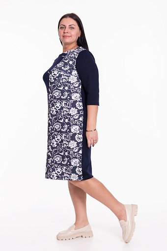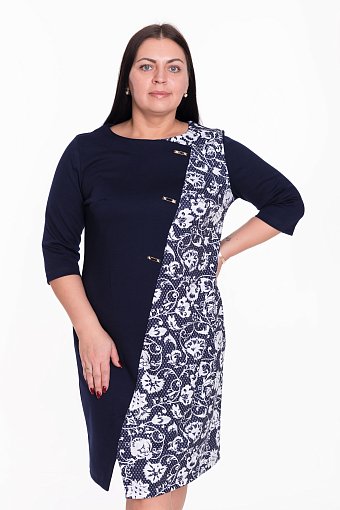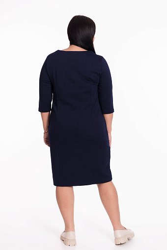 Платье женское выполнено из полотна академик, силуэт облегающий. Горловина имеет круглый вырез, рукава длиной 3/4. Спереди разрезная полочка со вставкой из отделочного полотна, в качестве декора пришиты пряжки, по низу изделия разрез.