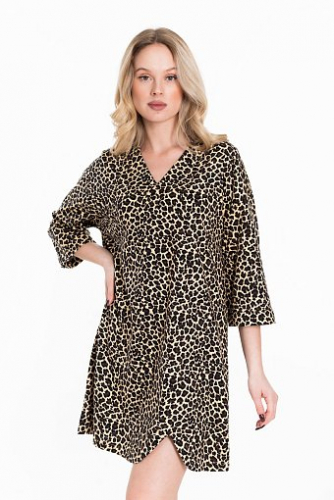 Туника выполнена из однотонной кулирки со вставками из отделочного полотна. Туника с втачным рукавом длиной 3/4 с патами. Спереди планка с пуговицами. По низу переда и спинки фигурные отделочные полосы.