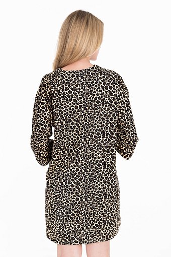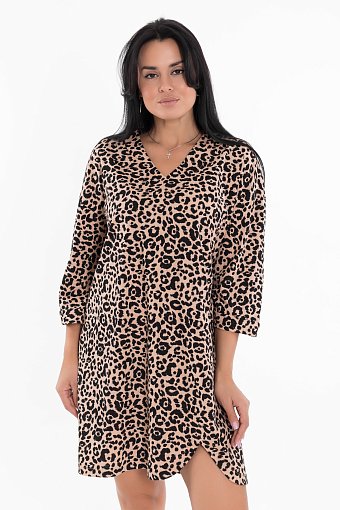 Женская туника из кулирки в бежевом цвете с набивным рисунком леопард - стильно и современно. V-образная горловина добавляет женственности и изящества в образ. Рубашечный крой рукавов длиной 3/4 с отложными манжетами придает изделию модный и элегантный вид. Фигурный вырез по низу туники создает интересный и уникальный акцент, придавая изделию изысканный вид. Набивной рисунок леопард подчеркивает индивидуальность туники, делая ее заметной и привлекательной.
