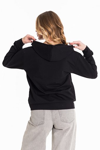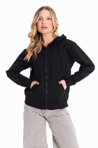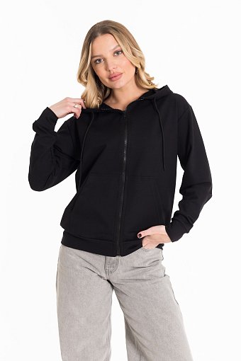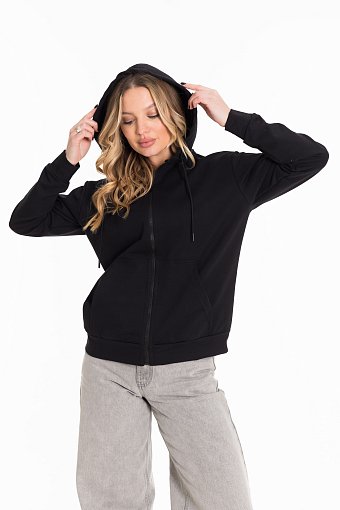 Толстовка базовой модели выполнена из футер петли. Линия плеча чуть спущена, капюшон со шнуром, манжеты рукавов и пояс изделия из основного полотна. Спереди карманы и застежка на молнию.