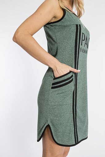 Сарафан молодёжный выполнен из однотонного хлопкового полотна. Круглый вырез горловины и закруглённый низ изделия с разрезами по бокам, оформлены бейкой. Спереди, в качестве отделки принт и кокетка с молнией, лампасы. С левой стороны размещён карман.