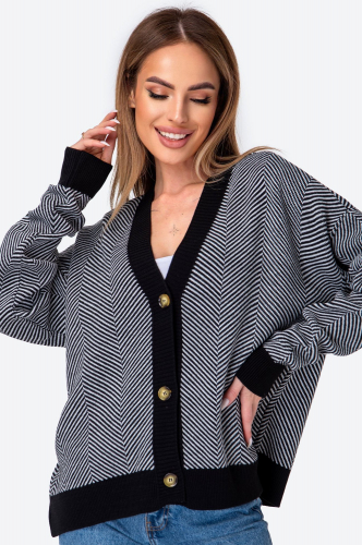 Крой oversize идеален для объёмных силуэтов – свободная кофта смотрится эффектно с любым низом. Длинные рукава, V-вырез горловины и пуговицы коричневого цвета – очаровательный акцент.
