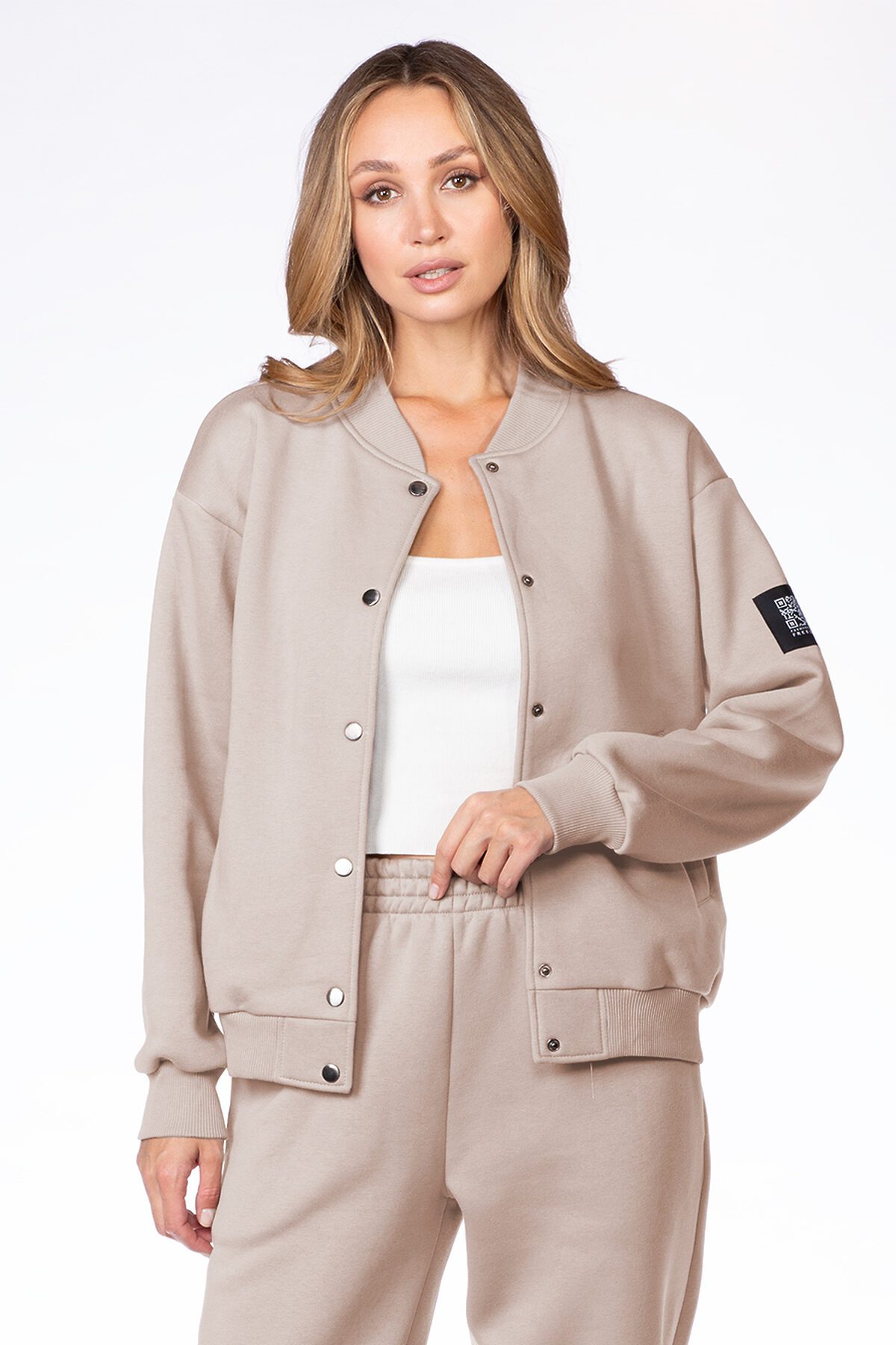 Модель свободного кроя, с втачным рукавом, декорированным жаккардовым именным шевроном QR-код. Бомбер застегивается на кнопки, с удобными боковыми карманами. Низ изделия, манжеты и ворот выполнены из эластичного фактурного материала.