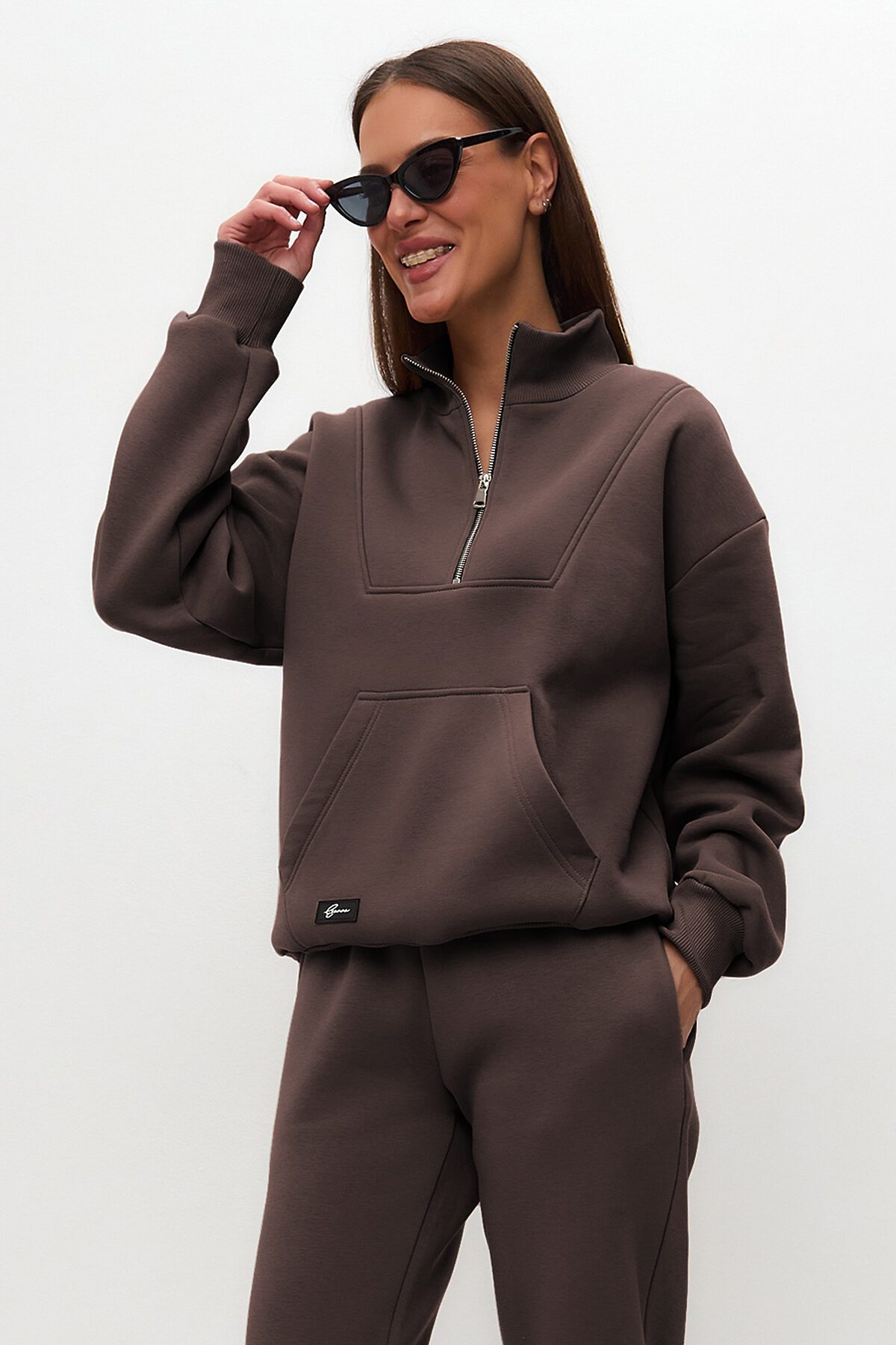 Худи свободного кроя, со спущенной линией плеча. Манжет и низ изделия выполнен из качественного эластичного материала в рубчик, декорирован брендированным шевроном. Ворот на короткой металлической молнии акцентирован декоративным швом и карманом-кенгуру в зеркальном отражении. Зауженная резинка по низу создает силуэт "бочонка".