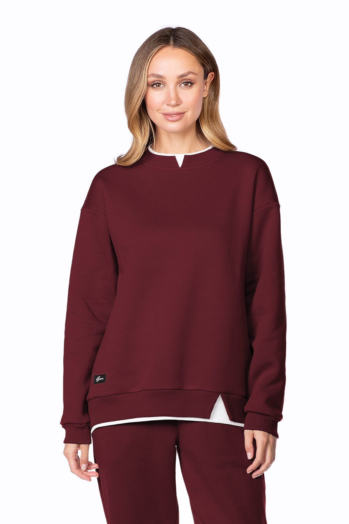 Утепленный женский свитшот свободного кроя с круглым вырезом горловины. Низ свитшота из горловина из эластичного фактурного кашкорсе, продублированного контрастной белой вставкой, имитирующей выглядывающую футболку снизу.