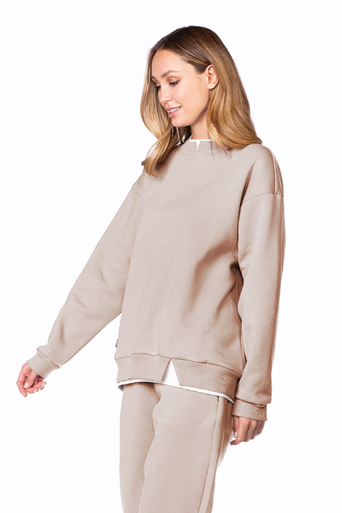 Утепленный женский свитшот свободного кроя с круглым вырезом горловины. Низ свитшота из горловина из эластичного фактурного кашкорсе, продублированного контрастной белой вставкой, имитирующей выглядывающую футболку снизу.