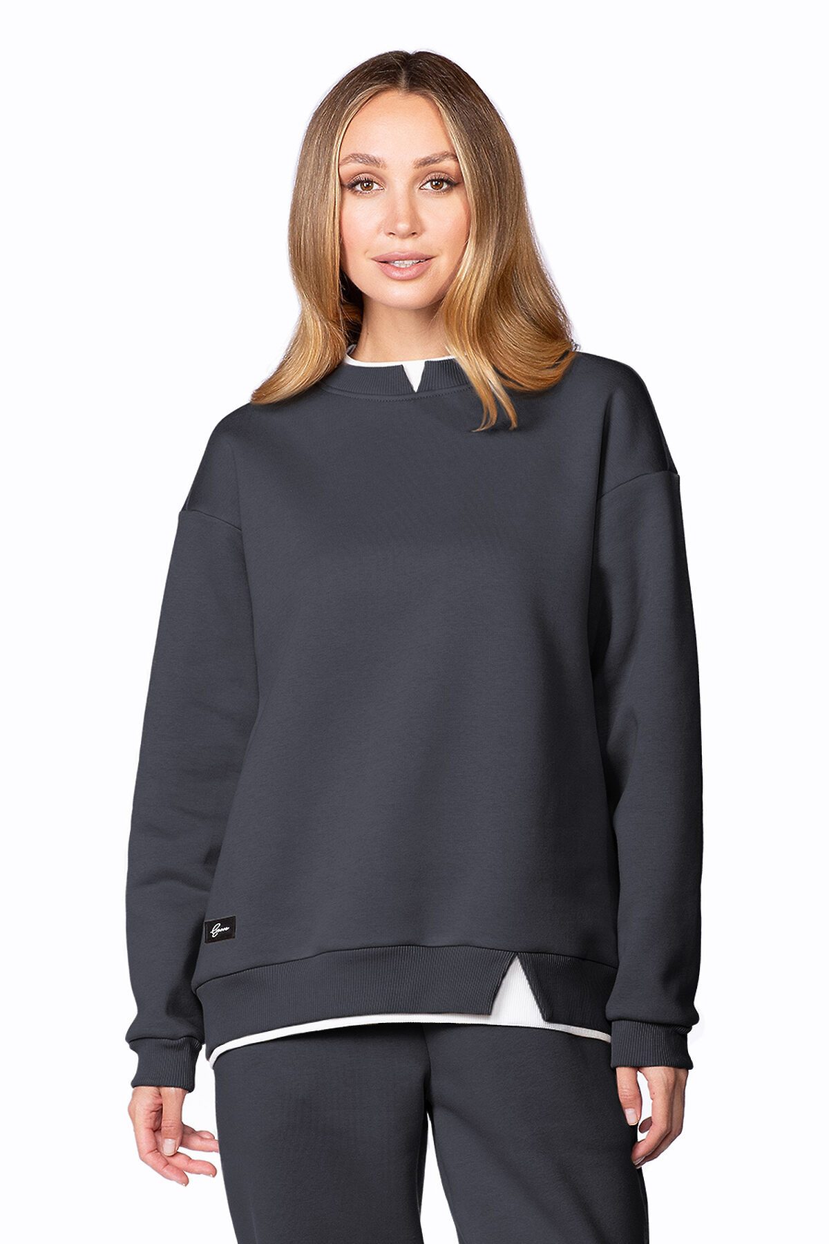 Утепленный женский свитшот свободного кроя с круглым вырезом горловины. Низ свитшота из горловина из эластичного фактурного кашкорсе, продублированного контрастной белой вставкой, имитирующей выглядывающую футболку снизу.