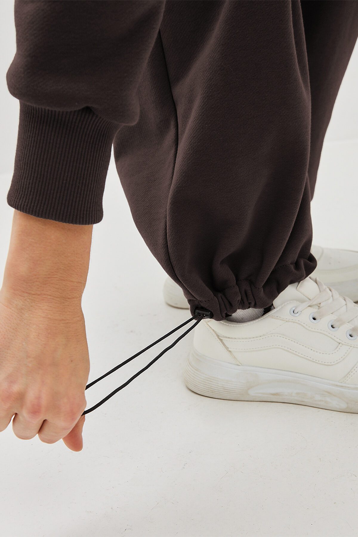 Брюки широкого кроя, пояс выполнен из основной ткани, удобные боковые карманы. По низу брючин регулируемая резинка-утяжка, которая позволяет носить брюки как палаццо прямого кроя, либо затянув низ - как джоггеры. В таблице замеров указаны параметры готового изделия (не обхваты фигуры).