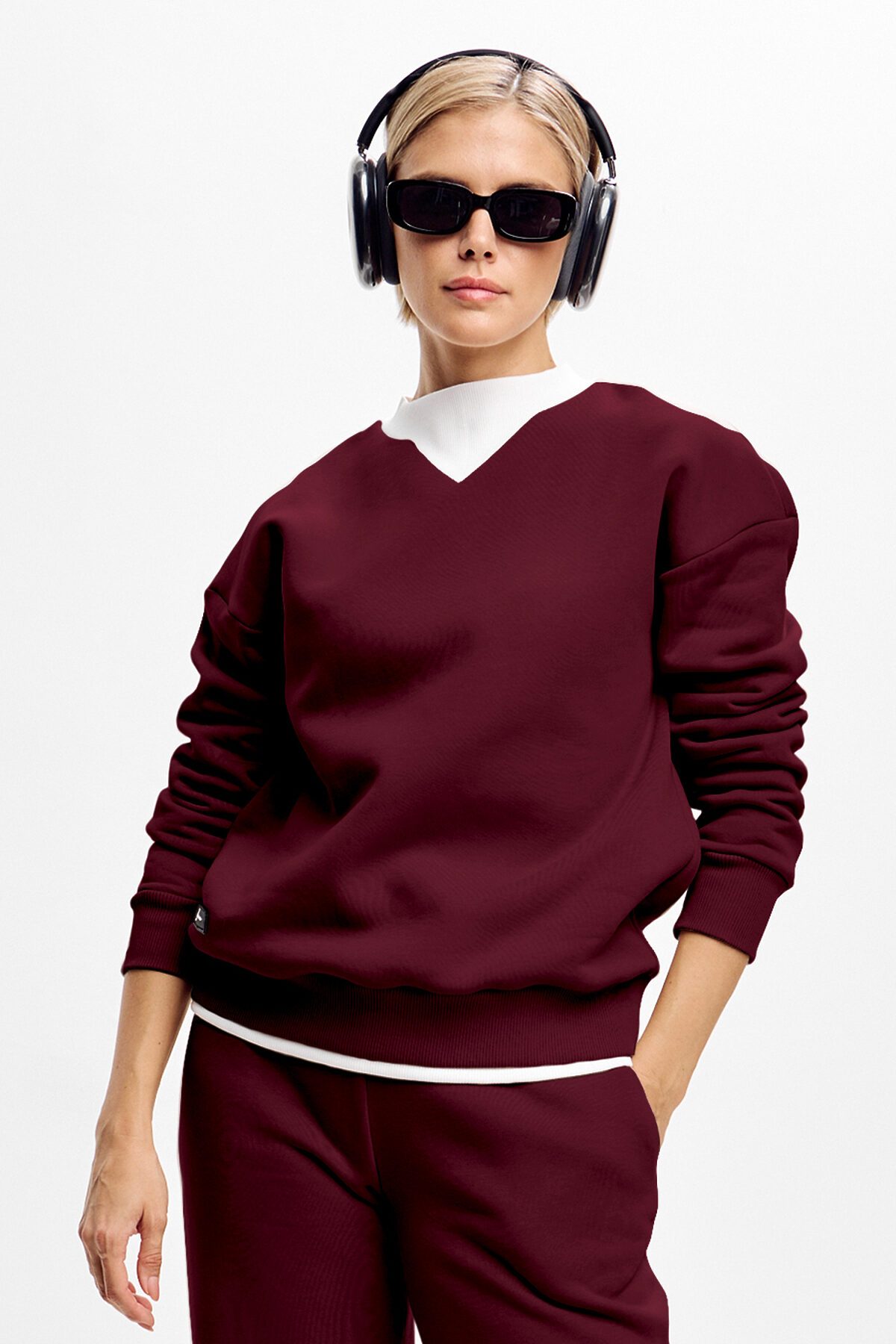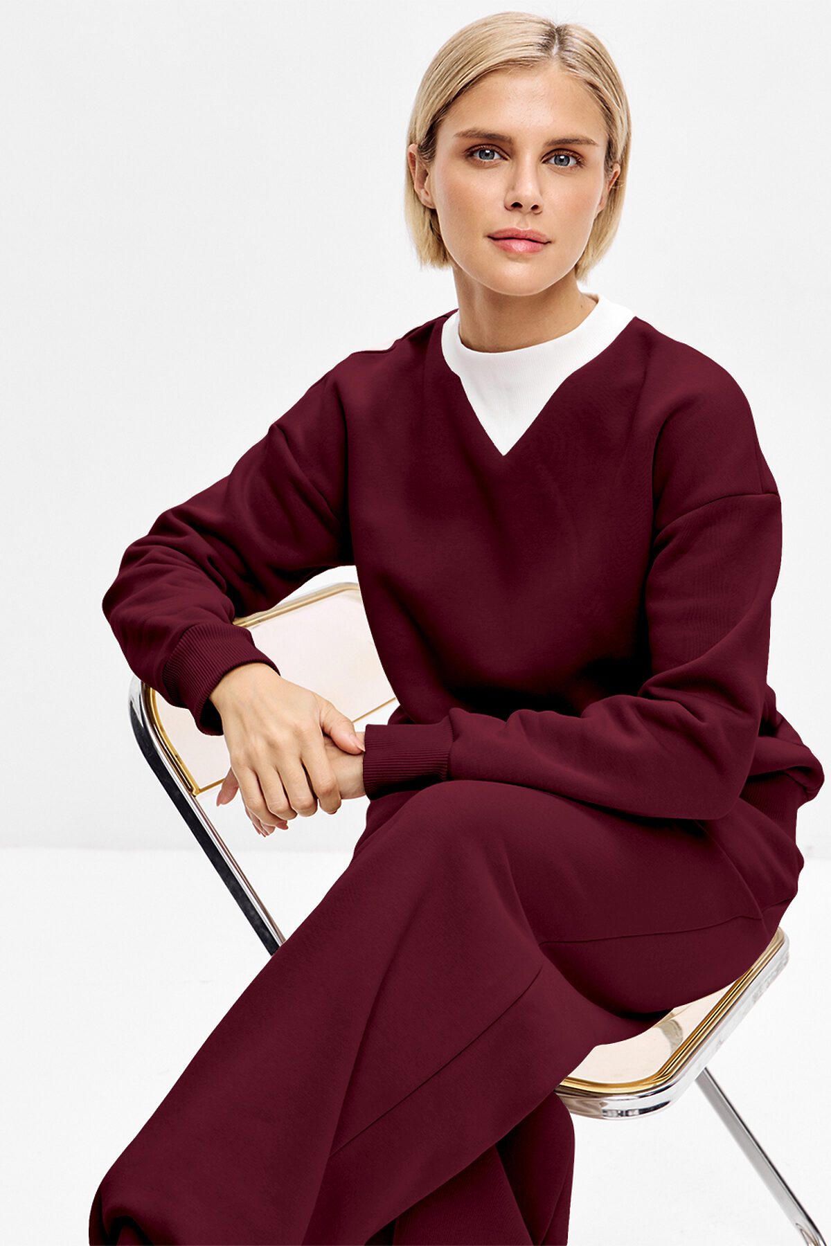 Модель оверсайз, со спущенной линией плеча. Контрастная белая горловина оригинальной формы и дублирующая белая полоска по низу. Горловина, манжеты и низ изделия выполнены из качественного эластичного материала в рубчик.