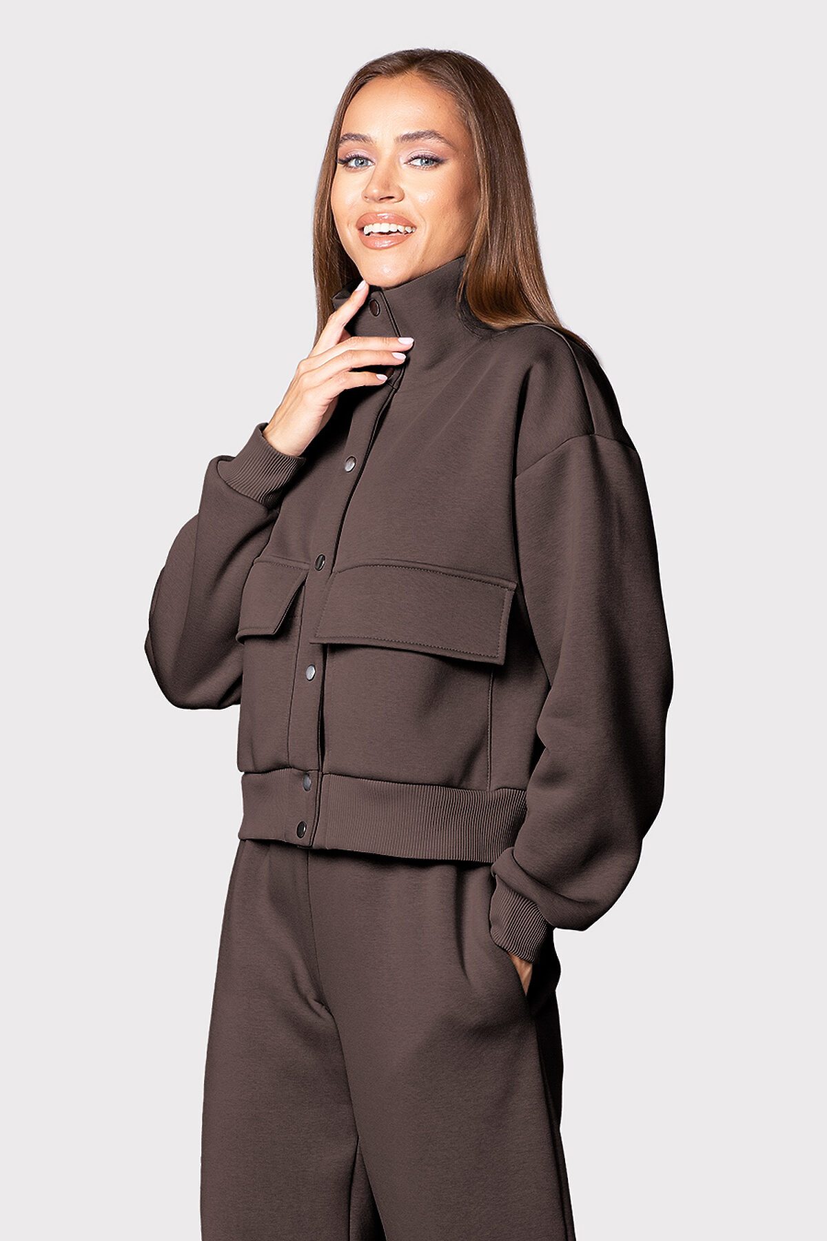 Жакет укороченный, свободного кроя, с длинным рукавом и высоким воротом стойкой. Застегивается на кнопки, с объемными накладными карманами с клапанами. Низ изделия и манжеты выполнены из эластичного фактурного материала.