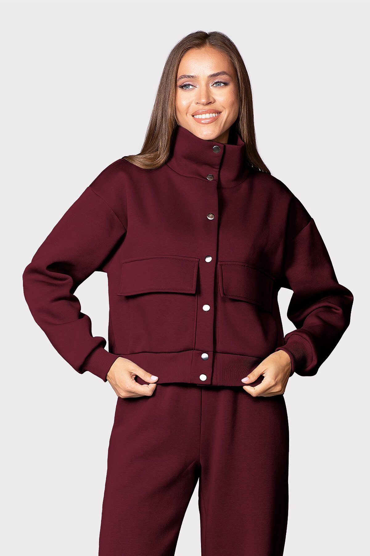 Жакет укороченный, свободного кроя, с длинным рукавом и высоким воротом стойкой. Застегивается на кнопки, с объемными накладными карманами с клапанами. Низ изделия и манжеты выполнены из эластичного фактурного материала.