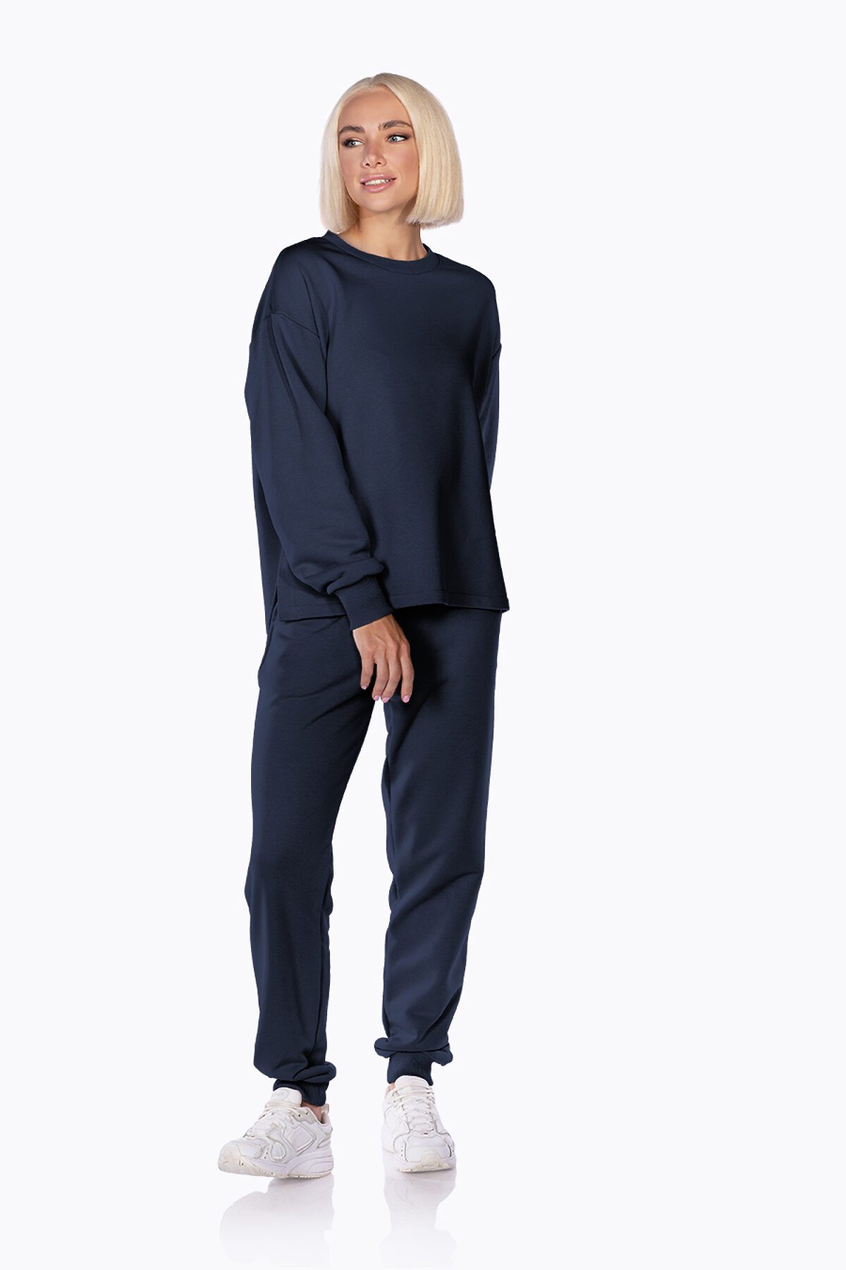 Свитшот свободного кроя, удлиненный по спинке, с длинным рукавом и боковыми разрезами. Отделка манжетов и горловины кашкорсе.