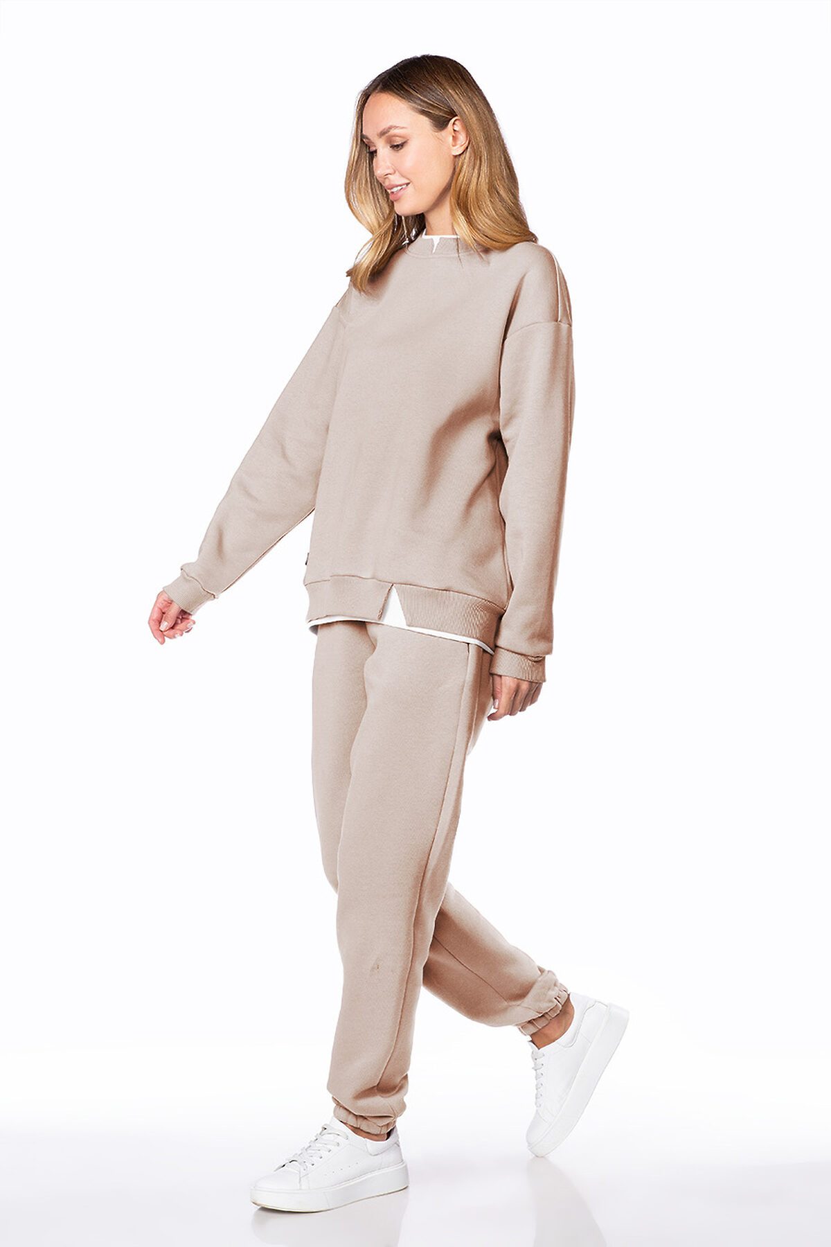 Утепленный женский свитшот свободного кроя с круглым вырезом горловины. Низ свитшота из горловина из эластичного фактурного кашкорсе, продублированного контрастной белой вставкой, имитирующей выглядывающую футболку снизу.