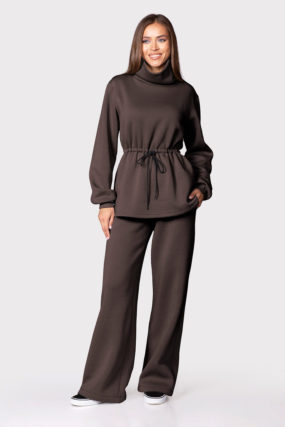Удлиненный свитшот с объемным воротом и длинным рукавом на манжете. Приталивается и подчеркивает талию засчет кулиски на текстильных завязках с утяжкой. Декорирован именным шевроном с логотипом Ezanna.
