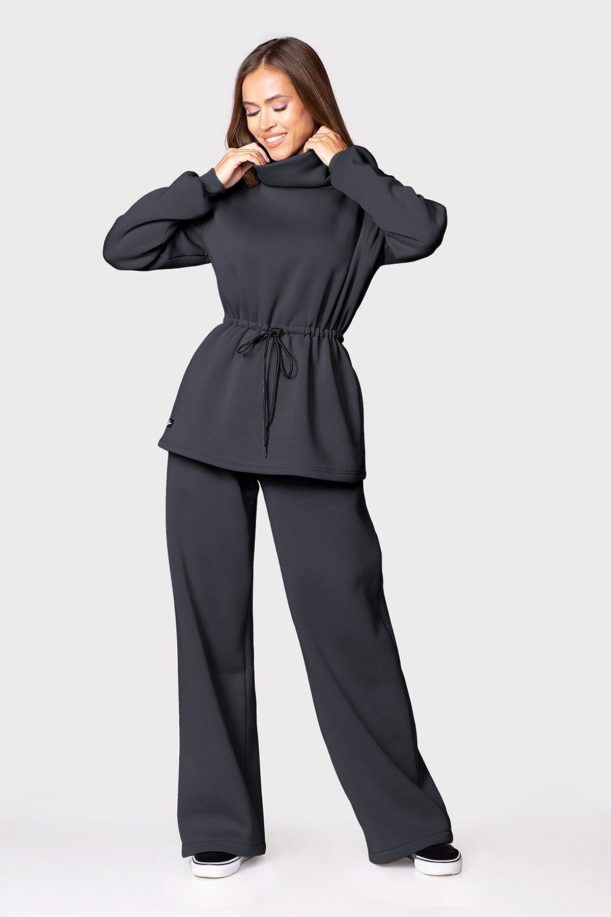 Удлиненный свитшот с объемным воротом и длинным рукавом на манжете. Приталивается и подчеркивает талию засчет кулиски на текстильных завязках с утяжкой. Декорирован именным шевроном с логотипом Ezanna.