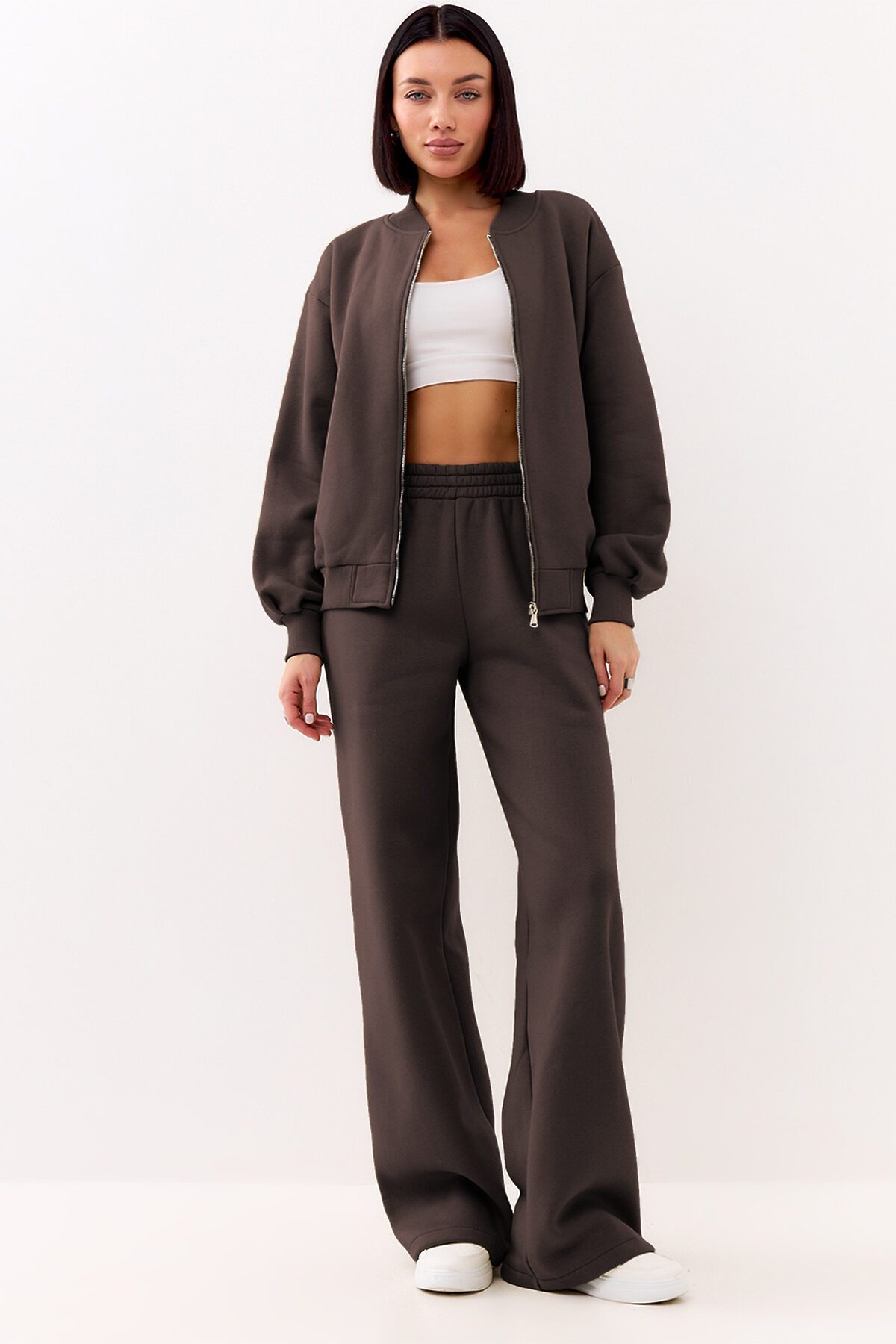одель свободного кроя, с втачным рукавом и округлым вырезом горловины. Бомбер застегивается на металлическую молнию, с удобными боковыми карманами. Низ изделия, манжеты и ворот выполнены из эластичного фактурного материала.