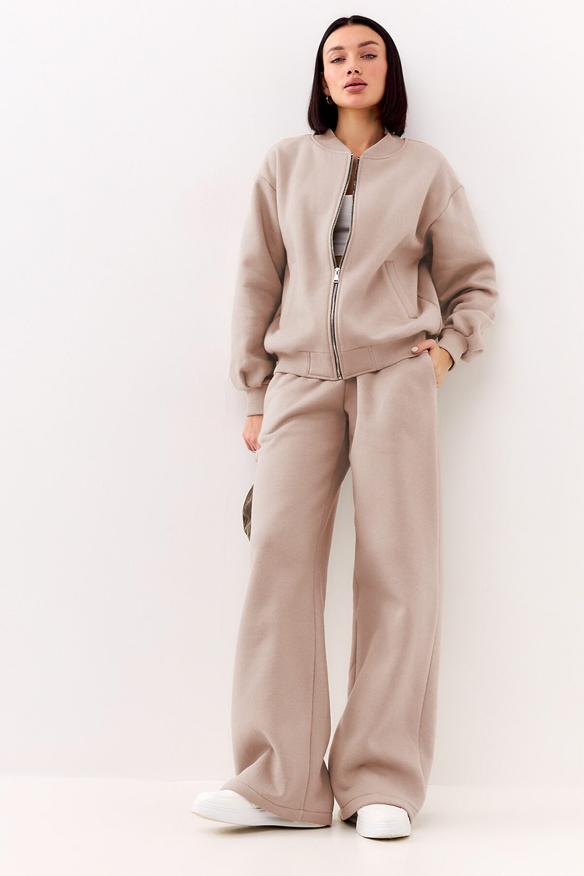 одель свободного кроя, с втачным рукавом и округлым вырезом горловины. Бомбер застегивается на металлическую молнию, с удобными боковыми карманами. Низ изделия, манжеты и ворот выполнены из эластичного фактурного материала.
