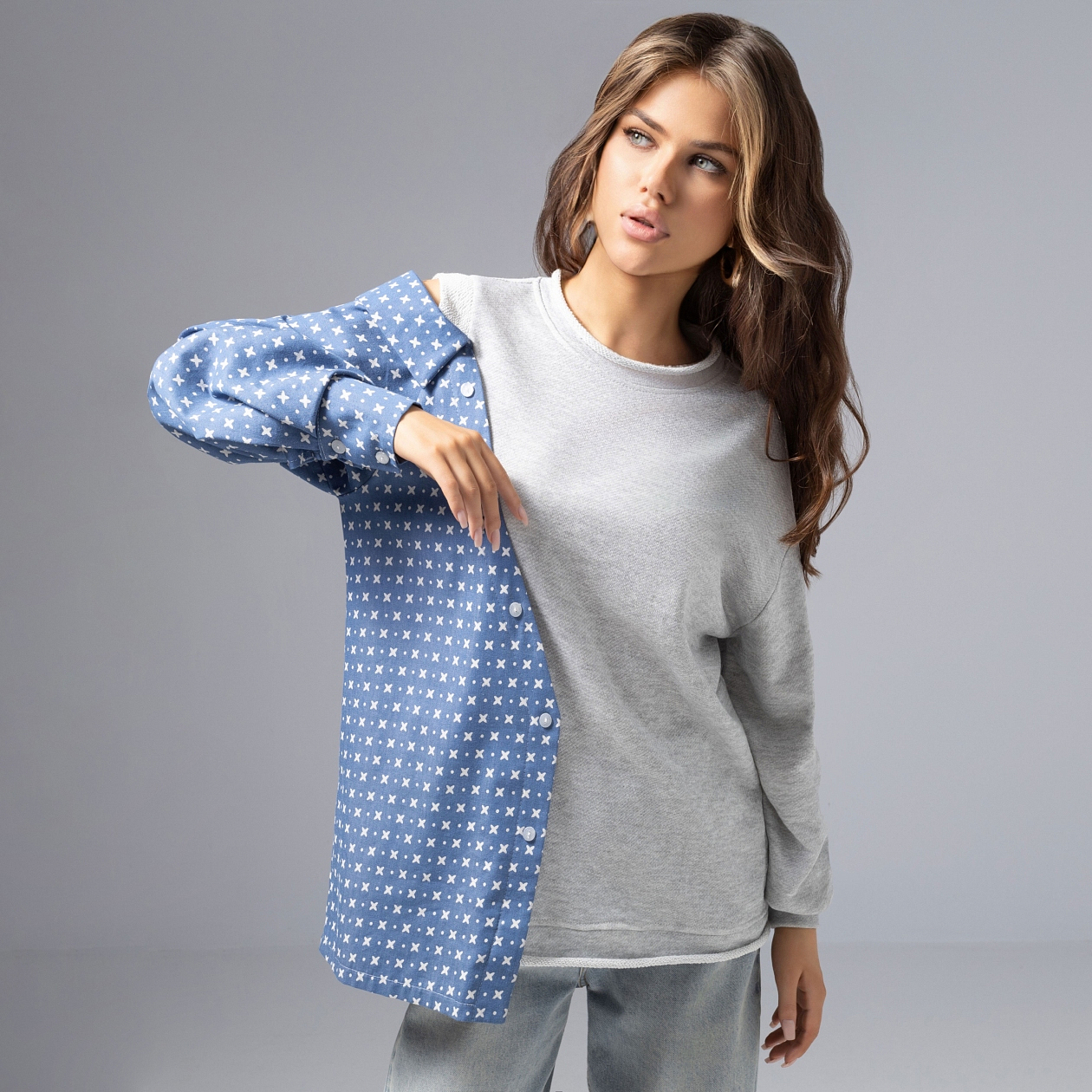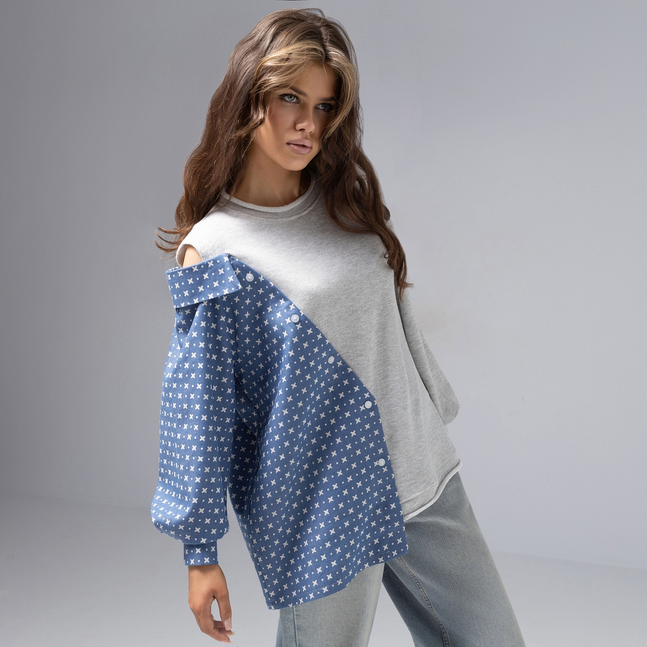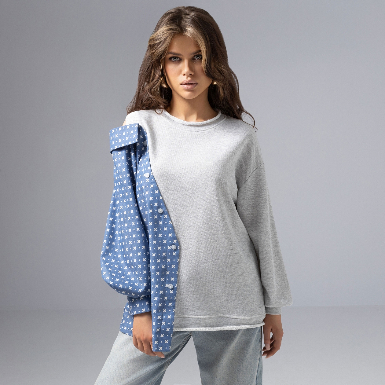 Каждый твой выход – маленькая революция стиля. Модная асимметрия, как у Stella McCartney или JW Anderson, приковывает к тебе все взгляды. Так дерзкая идея стала главным модным событием в твоем гардеробе. Свитшот-рубашка с креативной деталью на плече легко комбинируется, добавляет дерзкий акцент, подойдет поклонницам модного эксперимента.