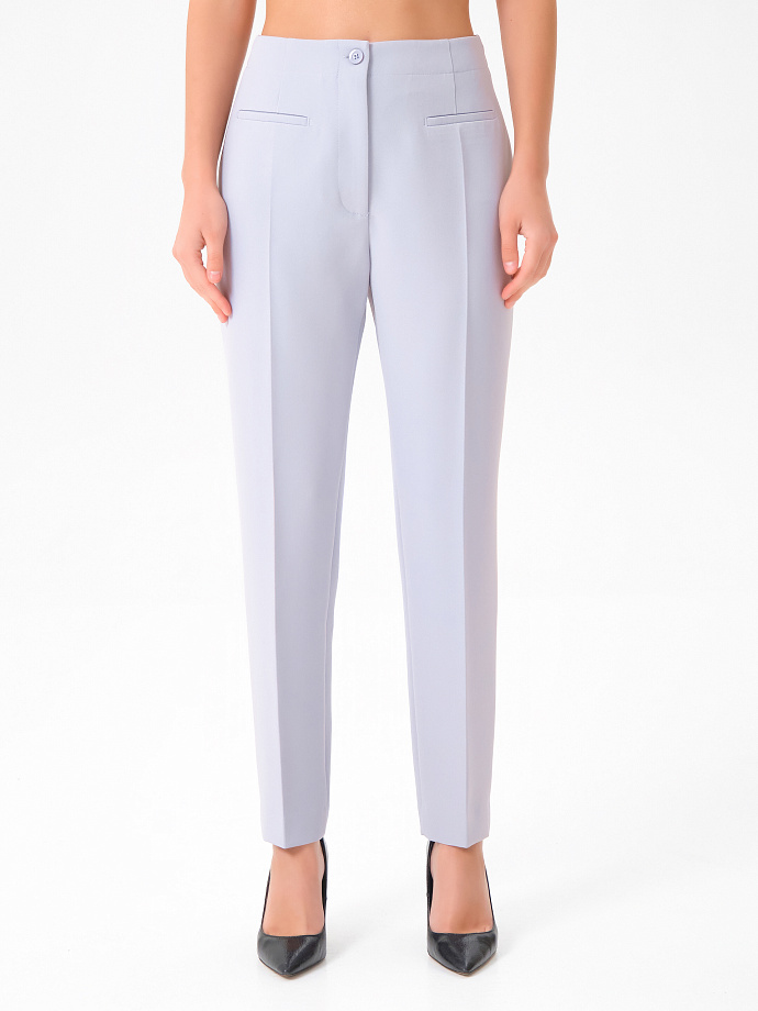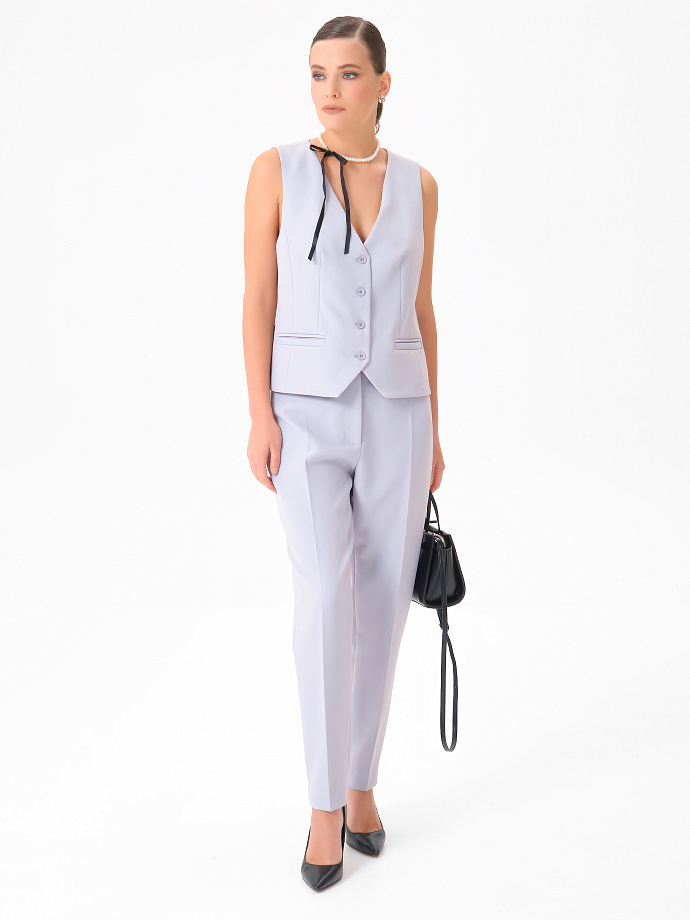 Спереди прорезные карманы с узкими листочками. Модель без пояса, декорирована отделочными строчками.