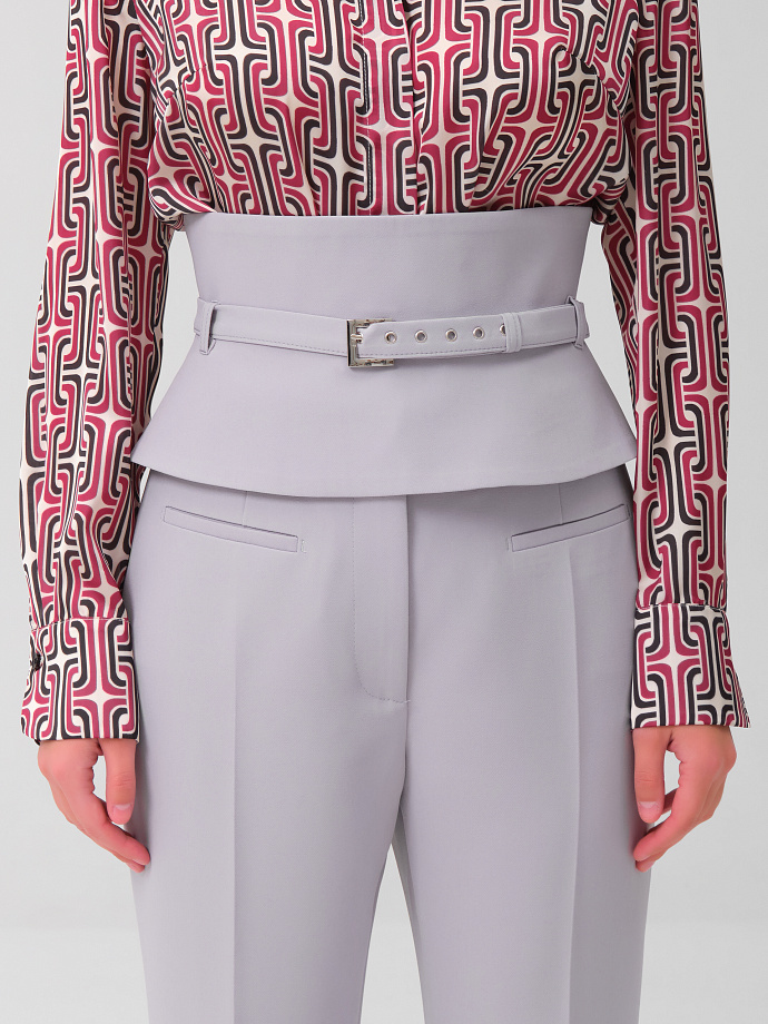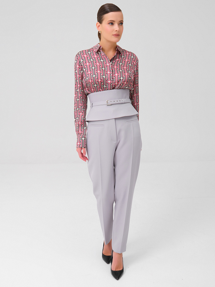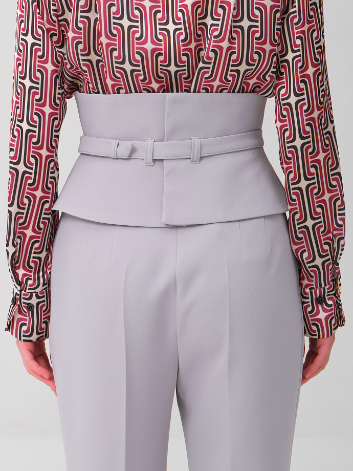 Модель отрезная по талии, со шлёвками, в которые вставлен пояс из основной ткани с пряжкой.