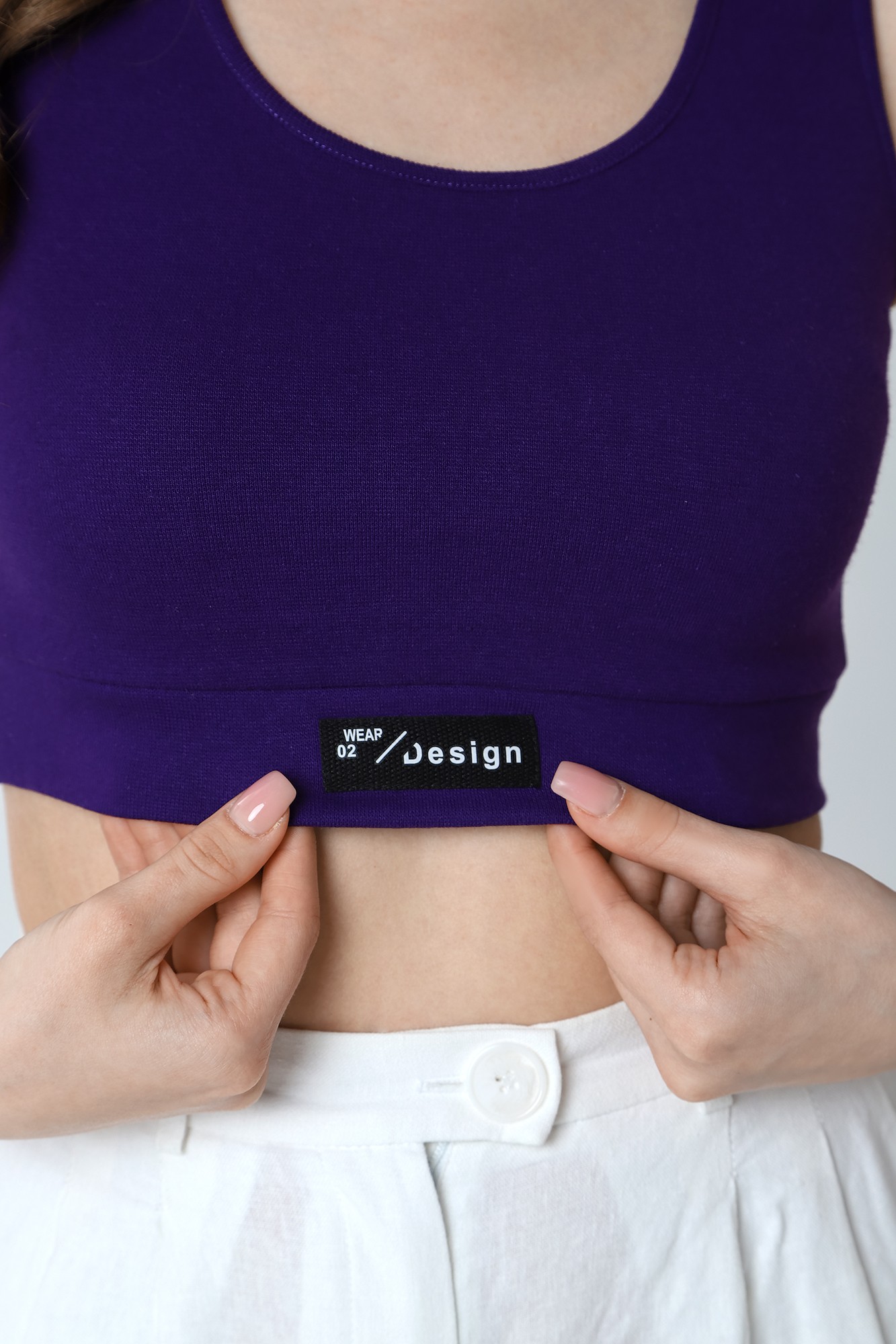 Кроп-топ – из полотна «рибана» без рукавов, с горловиной овальной формы, обработанной окантовкой из основного материала и притачным поясом по низу. В центре пояса настрочен декоративный элемент.