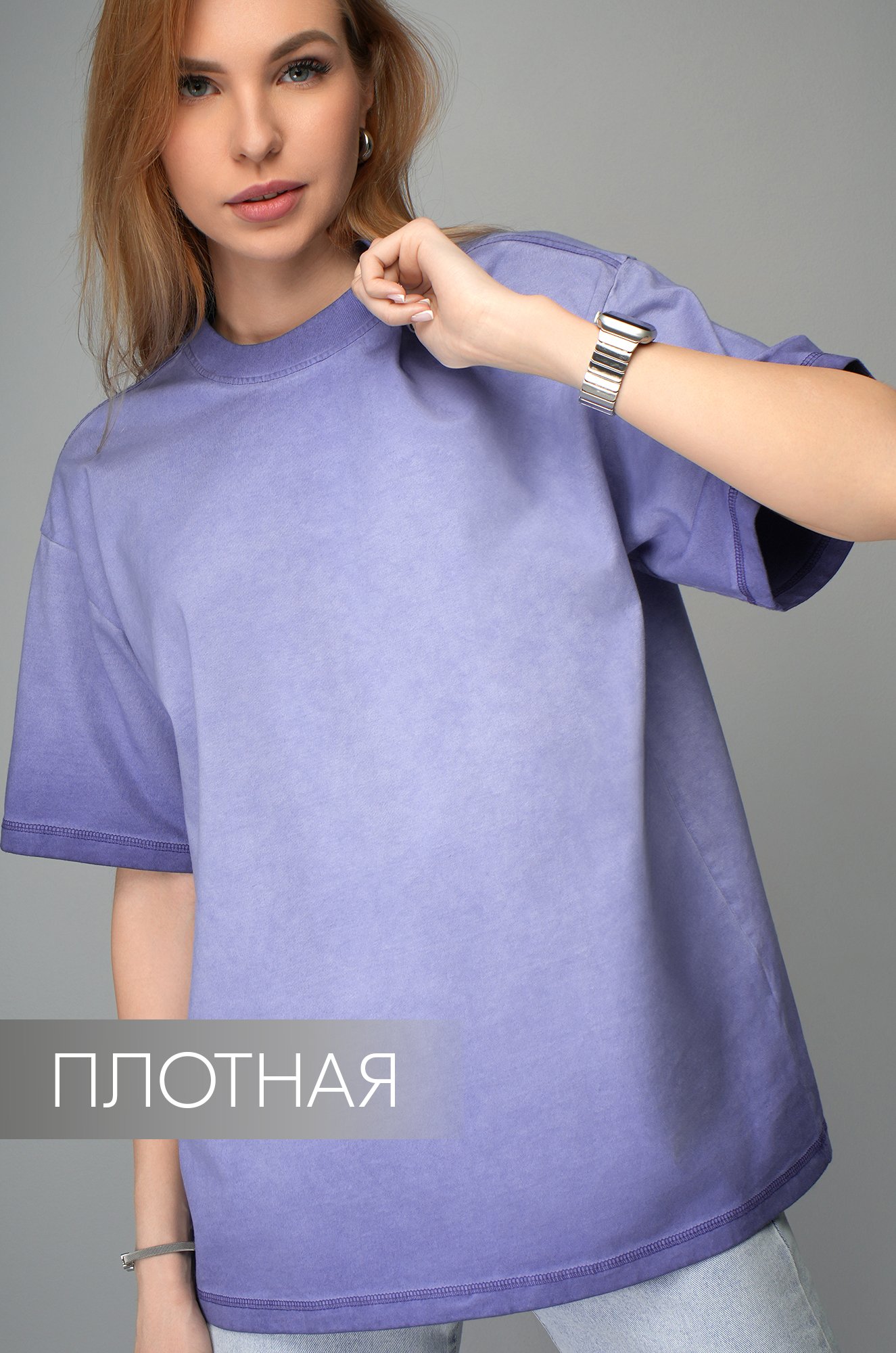Фиолетовая футболка с градиентом для женщин станет стильным акцентом на прогулке, встрече с друзьями или отдыхе.