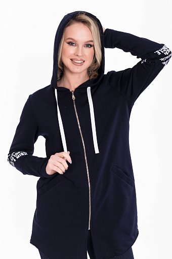 Кардиган с застёжкой на молнию выполнен из однотонного футера трёхнитки (воздушка). С длинным втачным рукавом, с капюшоном и прорезными карманами спереди. Низ кардигана имеет необработанный вид. На рукавах и капюшоне принт. Сзади, в среднем шве разрез.