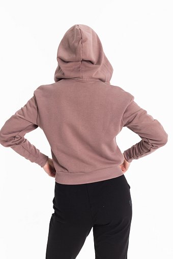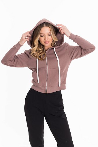 Толстовка выполнена из футера трёхнитки (воздушка). Капюшон со шнуром, манжеты рукавов и пояс изделия из кашкорсе. Спереди карманы.