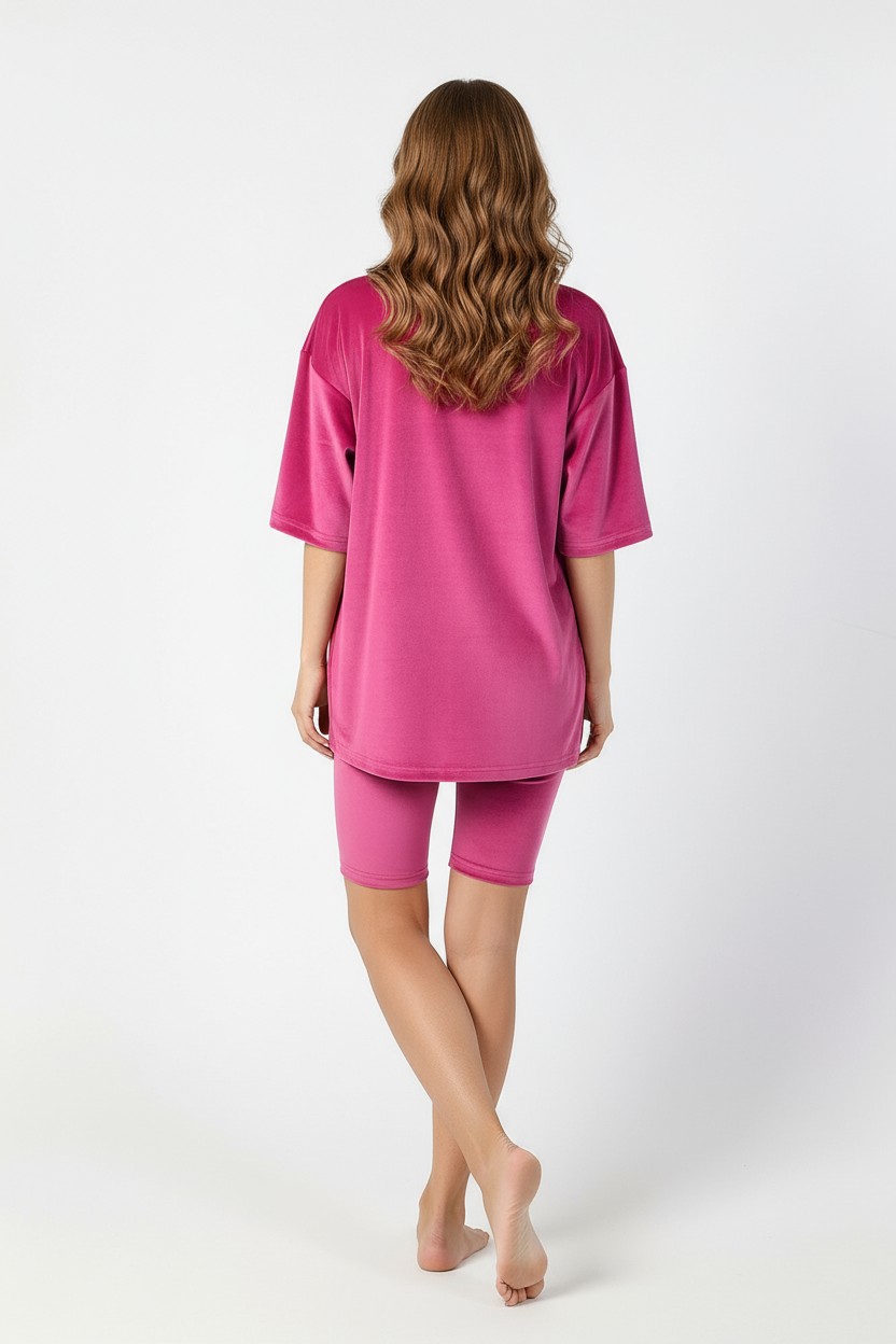 Костюм из гладкокрашеного трикотажного полотна «велюр стрейч», состоящий из футболки и леггинсов. Футболка – удлиненная, свободного покроя, со спущенной, линией плеча, короткими втачными рукавами, горловиной овальной формы, обработанной втачной планкой.Леггинсы – длиной до колен, с эластичной тесьмой по талии.