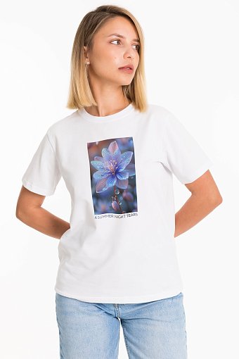 Женская футболка с принтом спереди изготовлена из хлопкового полотна с добавлением лайкры. Футболка с коротким втачным рукавом и круглым вырезом горловины, что придает ей классический стильный вид. Такая модель футболки отлично сочетается с джинсами, брюками или юбкой. Изготовленная из натуральной ткани, футболка обеспечит комфорт в течение всего дня.